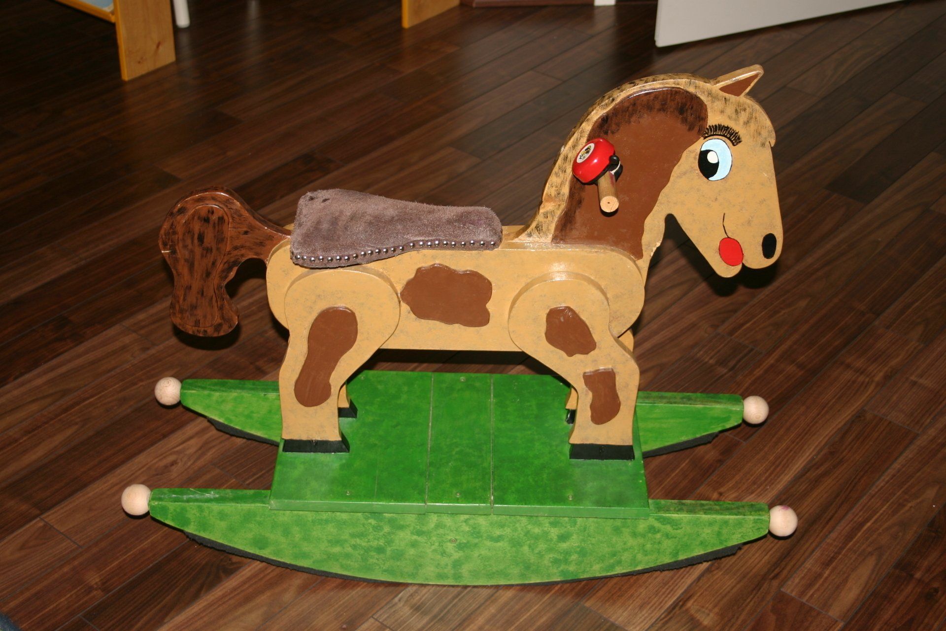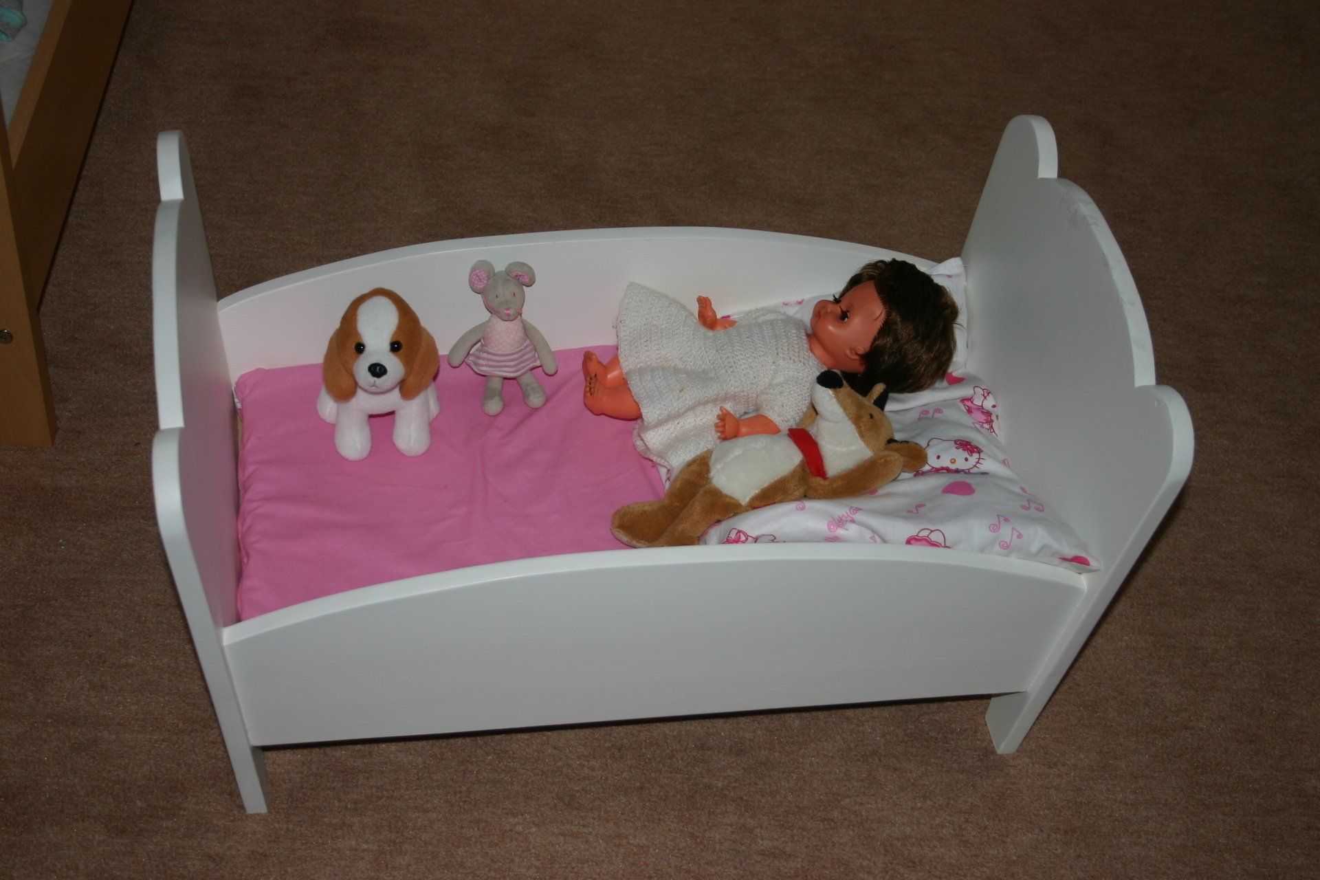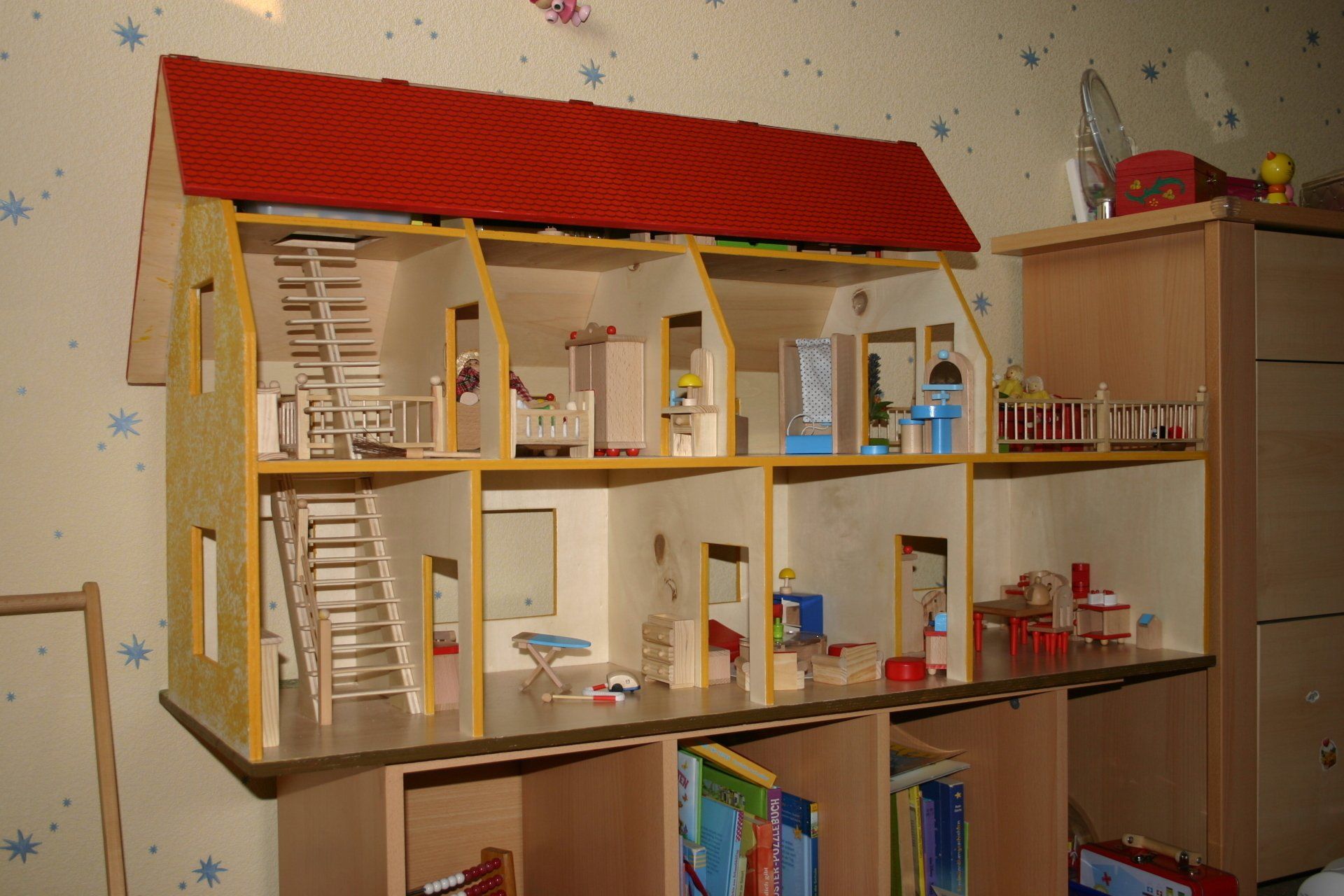 Mit der Geburt der ersten Enkelin fing das Arbeiten mit Holz so richtig an. Als erstes wurde ein Sandkasten mit Abdeckung gebaut, anschließend ein Schaukelpferd. Es folgten dann unter anderem ein Lauflernwagen, der aber mehr als Kinderwagen als für den Puppentransport genutzt wurde. Dann ein großes Puppenbett, ein Puppenhaus, ein Kaufmannsladen, ein Puppenkleiderschrank, eine Malstaffel und vieles mehr.